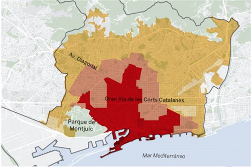 巴塞羅那市區被劃為四大塊(如圖所示),以深紅、淺紅、深黃和淺黃四色劃分,顏色越深,酒店業限制越嚴厲。