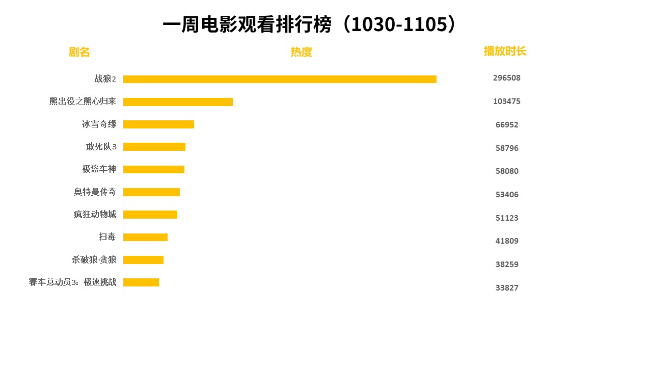 新聞來源:宏輝智通 發布日期:2017-11-09 瀏覽次數:2920廣東IPTV發布IPTV10月30日-11月5日電視劇、電影、綜藝、卡通節目觀看排行榜。電視劇觀看排行榜前三位是《寒山令》、《三生三世十里桃花》、《情滿四合院》; 電影觀看排行榜前三位是《戰狼2》、《熊出沒之熊心歸來》、《冰雪奇緣》;綜藝觀看排行榜前三甲《蒙面唱將猜猜猜2》、《快樂大本營》、《青春旅社》;卡通觀看排行榜前三位是《熊出沒》《兔小貝兒歌》、《貓和老鼠》。