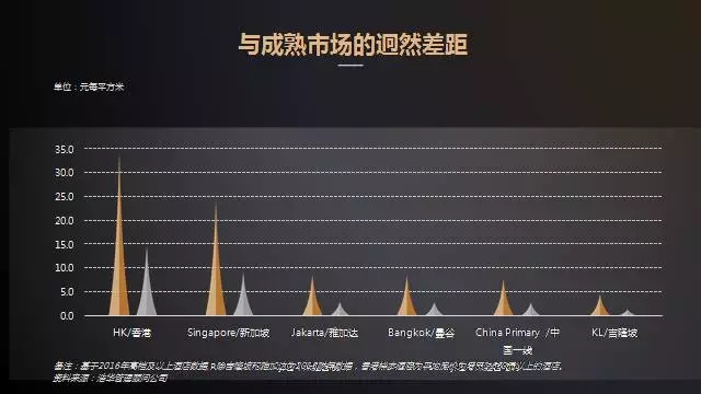 受限于中國經濟發展與消費力水平,即便是2016年創下了近年業績新高的中國一線城市與成熟市場香港和新加坡的經營收入差距仍然十分顯著,后者是前者的2.5倍左右。