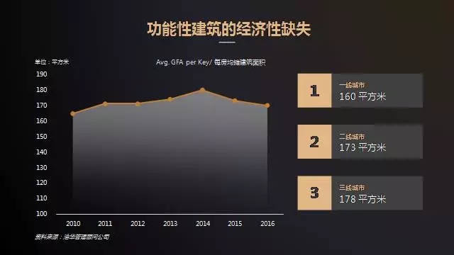 經營收入走低的同時,酒店建筑在空間規劃上又片面強調高大上從而缺乏經濟性,這進一步拉低了中國五星級酒店的坪效表現。