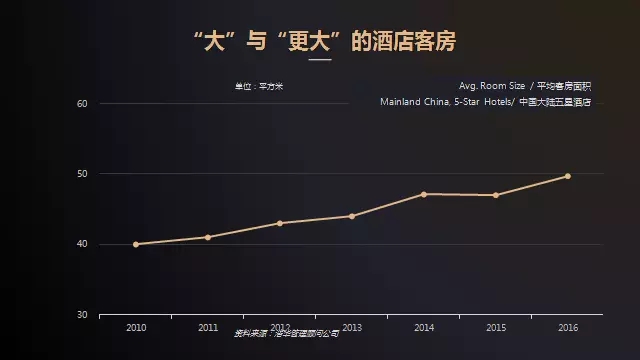 現實的數據表明中國市場一直在追逐著“大”與“更大”的游戲。五星級酒店的平均客房面積逐年上漲,從2010 年的每房40平方米持續上升至2016年的50平方米。盡管最近兩年更趨理性、更重財務回報的酒店投資趨勢開始出現,但這一趨勢顯現的效果仍有一定的滯后性。隨著最近5年規劃的高檔酒店逐漸落地,我們看到未來短期內客房面積依然有小幅上揚的趨勢。