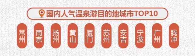 用戶比較青睞前往哪些目的地進行溫泉游?國內方向,以江蘇、安徽、浙江以及云南為主,人氣目的地前十名分別為常州、南京、揚州、黃山、廈門、蘇州、安吉、寧波、廣州、騰沖,人氣較高的溫泉(度假區)有天目湖御水溫泉、南京湯山溫泉、常州恐龍谷溫泉、揚州瘦西湖溫泉度假村、黃山醉溫泉度假酒店、廈門日月谷溫泉度假村、廣州碧水灣溫泉度假村、蘇州四季悅溫泉、安吉江南天池溫泉、騰沖火山熱海溫泉。