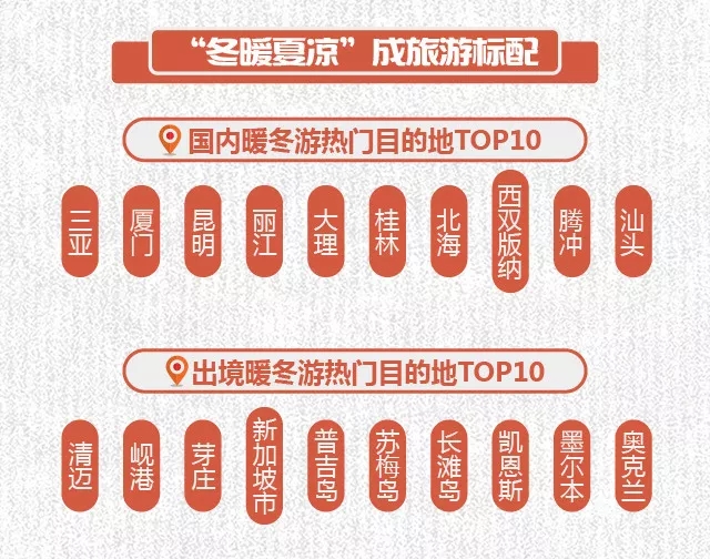隨著交通運力的不斷提升,國內游客開始有條件像“候鳥”一般,在冬季來一場過冬“大遷徙”。值得一提的是,在琳瑯滿目的暖冬游產品中,線路是否具有養生特點,除了溫暖的氣候條件外,還需輔以充沛的日照、水文資源,以及動靜相宜的玩法。綜合來看,全國范圍暖冬養生游目的地主要集中在三亞、廈門、昆明、麗江、大理、桂林、北海、西雙版納、騰沖、汕頭等地;出境方向主要集中在東南亞的清邁、峴港、芽莊、新加坡市,熱帶海島如普吉島、蘇梅島、長灘島,以及長線游如澳洲的凱恩斯、墨爾本、奧克蘭等目的地城市。