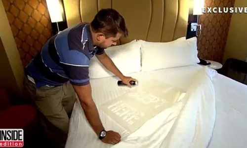 美國知名電視欄目“內幕新聞”9月13日播出了一場“臥底實驗”專題片:工作人員挑選了美國紐約9家高檔酒店入住一晚,第二天在結賬離開之前用一種特殊熒光劑在床單上寫下一句話“I SLEEP HERE”(我睡在這兒),還在枕頭上寫下“內幕新聞”的LOGO。這些字,人的肉眼看不見,但很容易清洗掉,也很容易在紫外燈下顯示。