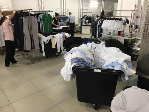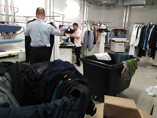 9月3日與9月4日,酒店的洗衣房迎來了自開業(yè)以來的巔峰時(shí)期,僅這兩天的收益就到達(dá)了平時(shí)1個(gè)月的水平。據(jù)悉,沙特代表團(tuán)在酒店期間,曾經(jīng)一間房有76件衣物需要清洗熨燙,堆放了整整一車。700多名代表共2000多件衣物被送至洗衣房。7個(gè)人24小時(shí)通宵工作,2臺(tái)機(jī)器16小時(shí)不間斷運(yùn)轉(zhuǎn),房務(wù)部、前廳部、人力資源部的同事都參與進(jìn)洗衣這項(xiàng)任務(wù)。相關(guān)負(fù)責(zé)人對(duì)記者表示,“夜間本來應(yīng)該安靜的洗衣房,在G20 期間真的是熱鬧非凡。洗衣房工作的流水線變得浩浩蕩蕩,從收客衣—清點(diǎn)—打標(biāo)簽—清洗—熨燙—折疊—衣物歸檔—送進(jìn)房間,好不壯觀!”