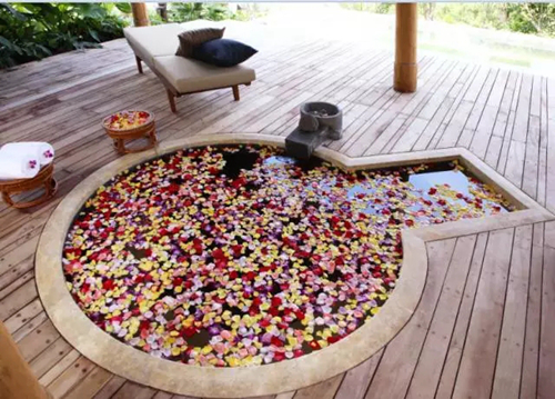 昆明柏聯(lián)溫泉酒店 21 間湯屋自帶泡池,在征得客人同意后,工作人員會在客人外出就餐時將泡池放滿水,撒上玫瑰花瓣。