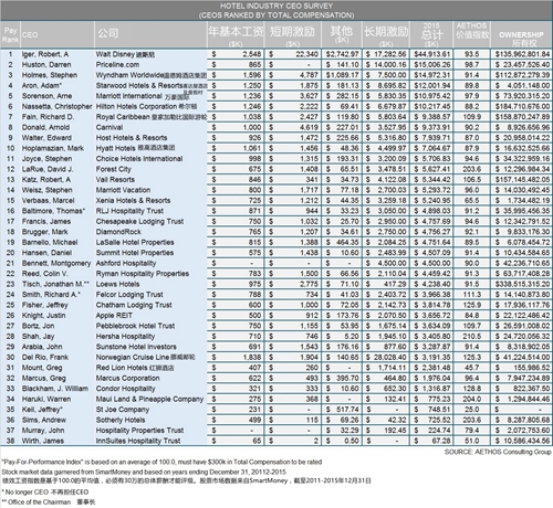 據AETHOS咨詢集團的一份最新報告, 該公司發布了其第20次對酒店首席執行官們的薪酬審查,發現2015年CEO的平均收入超過600萬美元,同時該行業的平均股權擁有量在同一時期超過4000萬美元。 該公司還采用績效薪酬模型評估了38位CEO的績效,考慮市值,股票升值,EBITDA增長和直接薪酬總額,以確定這些領導人是否贏得了他們的報酬。