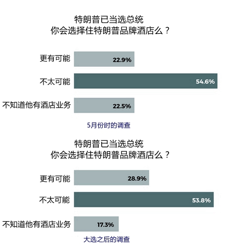 本次調查11月初通過向美國網民發送的Google消費者調查所得出來的結論,11月2號至4號,1542人中的大多數表示總統競選后不太可能會住特朗普品牌酒店。
