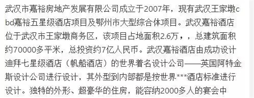 2013年12月25日一則中冶武勘武漢嘉裕五星級(jí)酒店工程試樁完工的新聞顯示,12月23日,隨著最后一塊混凝土壓塊的的吊下,標(biāo)志著中冶武勘武漢嘉裕五星級(jí)酒店深基坑工程工程試樁的順利結(jié)束。武漢嘉裕五星級(jí)酒店位于武漢市江漢區(qū)常青路與青年路交叉路口,緊鄰?fù)跫叶罩醒肷虅?wù)區(qū),共38層,總建筑面積約為14.53萬(wàn)平方米, 作為豪華商務(wù)及城市度假酒店,該項(xiàng)目標(biāo)準(zhǔn)為超白金五星級(jí)酒店及高檔商業(yè)廣場(chǎng),功能包含酒店、酒店式公寓、會(huì)議中心、水療及休閑設(shè)施、商場(chǎng)、影院等,建成后將成為體現(xiàn)武漢獨(dú)特城市風(fēng)韻的標(biāo)志性建筑。
