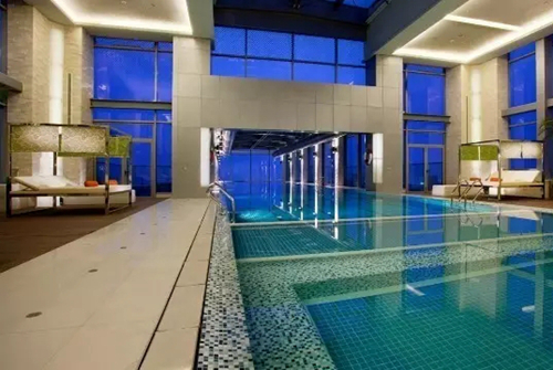 這么炫的設計,在國內(nèi)也有哦!中國第一座天幕室內(nèi)泳池,位于浦東綠地假日酒店24層。泳池總長30米,寬6米,深1.5米,由內(nèi)部延伸出建筑外部,懸掛在高空之中。