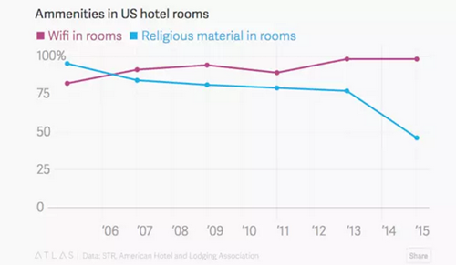 在美國,會在房間里置放圣經的酒店越來越少了;與圣經數量下降形成對比的是, Wi-Fi 越來越多。
