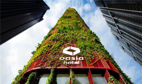 Oasia 酒店被認為是熱帶地區城市土地集約利用的一個典型案例,它的整體綠地率達到了 1100%。在林立的鋼筋水泥高樓群中,這個酒店看起來格外突兀——它的表面長滿了綠植,給人眼前一亮的感覺。