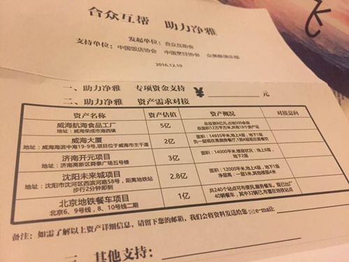 “幫扶計劃”共列出凈雅5項資產,其中威海大廈(建于2009年)、濟南開元項目(建于2010年)和沈陽未來城項目(建于2012年),屬于凈雅自有物業,以前用于經營門店,均位于當地黃金地段,占地面積1萬平米以上,共估值7.8億元。威海航海食品工廠建于2010年,占地500畝,曾用于凈雅海參和魚蝦等海鮮產品的儲藏和初加工,估值5億元。北京地鐵餐車項目是2013年8月凈雅為謀求轉型,通過收購“天天見面”推出的大眾餐飲項目,可在北京240個地鐵站點提供餐車服務。