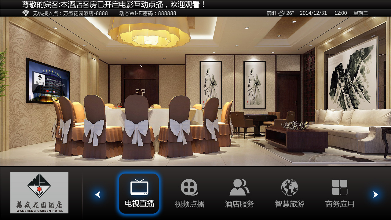 萬盛花園酒店 新聞來源:宏輝智通 發布日期:2015-11-29 瀏覽次數:9346 一、河南萬盛花園的外景圖 二、客房的精美設計 三、“輝視”系統歡迎界面 四、輝視系統的IPTV主界面 五、宏輝智通科技有限公司的工作人員在河南萬盛花園實施酒店IPTV解決方案 六、工作人員給酒店人員進行現場培訓 七、現場效果圖在酒店的應用 八、依然是我們“輝視”系統的后臺界面 上一篇:深圳市皇室假期水療會所 下一篇:吉林亞泰龍達飯店