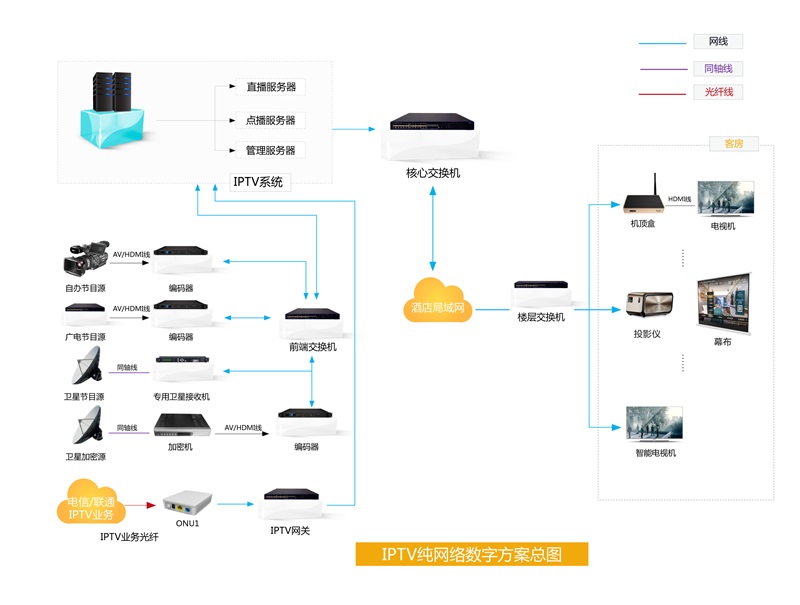? 頭端設(shè)備:天線、衛(wèi)星接收器、編碼器、數(shù)字接收機(jī)等,用于接收直播電視信號源,其中天線,衛(wèi)星接收器,有線電視信號等信號源和接收裝置需要酒店預(yù)先準(zhǔn)備。